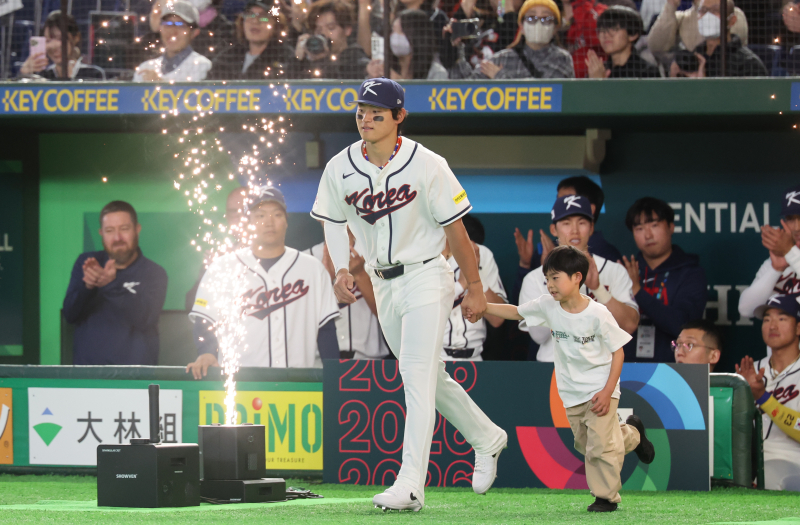 5일 일본 도코돔에서 열린 2026 월드베이스볼클래식(WBC) 조별리그 C조 1차전 한국과 체코의 경기에서 한국 김도영이 입장하고 있다. 2026.3.5 [연합뉴스]