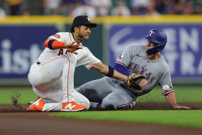HOUSTON, TEXAS - SEPTEMBER 17: Wyatt Langford #36 of the Texas Rangers steals second base against Jeremy Pe?a #3 of the Houston Astros during the first inning at Daikin Park on September 17, 2025 in Houston, Texas. Alex Slitz/Getty Images/AFP (Photo by Alex Slitz / GETTY IMAGES NORTH AMERICA / Getty Images via AFP)/2025-09-18 10:12:44/ <저작권자 ⓒ 1980~2025 ㈜연합뉴스. 무단 전재 재배포 금지, AI 학습 및 활용 금지>