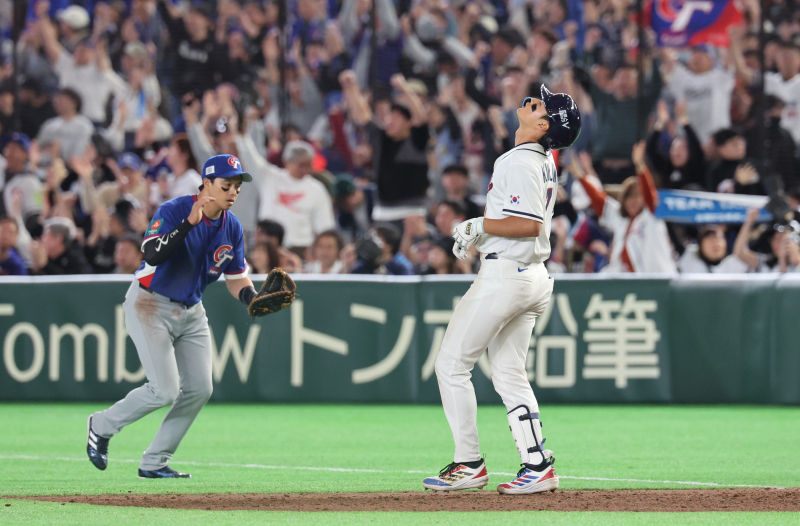 8일 일본 도쿄돔에서 열린 2026 월드베이스볼클래식(WBC) C조 조별리그 3차전 대한민국과 대만의 경기. 9회말 2사 1, 2루 한국 김주원이 중견수 플라이 아웃을 당한 뒤 아쉬워하고 있다. [사진=연합뉴스]