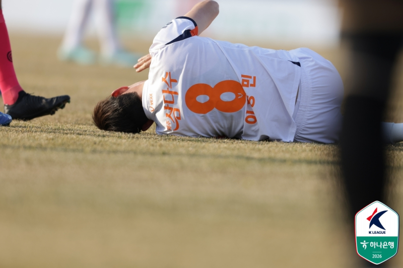 제주 이창민이 8일 안양종합운동장에서 열린 안양과의 하나은행 K리그1 2026 2라운드 중 통증을 호소하고 있다. 사진=프로축구연맹