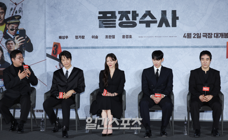 배우 윤경호, 조한철, 이솜, 정가람, 배성우, 박철환 감독이 9일 오전 서울 용산구 CGV용산아이파크몰에서 열린 영화 '끝장수사' 제작보고회에 참석해 MC와 작품 이야기를 하고 있다.