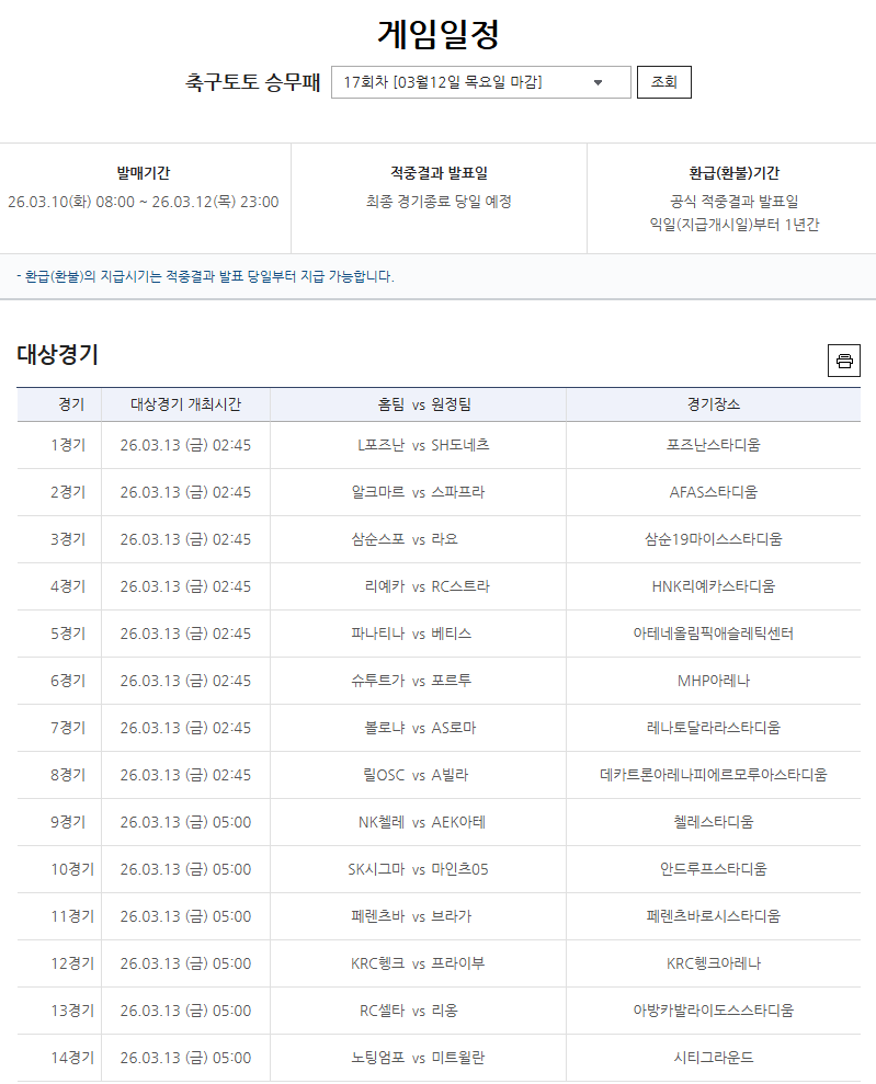 한편, 축구토토 승무패 17회차는 3월 10일 오전 8시부터 발매를 개시해 12일 오후 11시까지 구매할 수 있다.