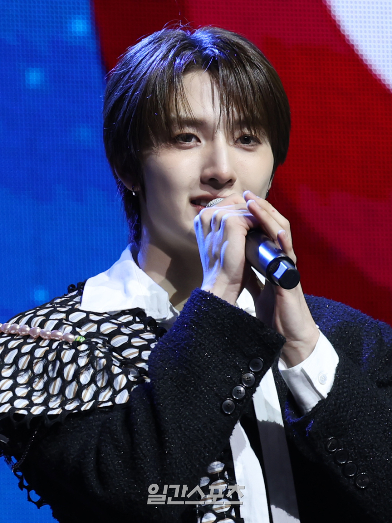 누에라(NouerA) 준표가 9일 오후 서울 광진구 예스24라이브홀에서 열린 세 번째 미니앨범 'POP IT LIKE(팝 잇 라이크)' 발매 기념 쇼케이스에 참석해 인사말을 하고 있다.