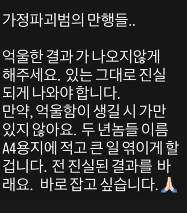 남현희는 9일 자신의 SNS에 “가정파괴범의 만행들”이라는 글을 올리며 “억울한 결과가 나오지 않게 해달라. 있는 그대로 진실이 나와야 한다”고 밝혔다.