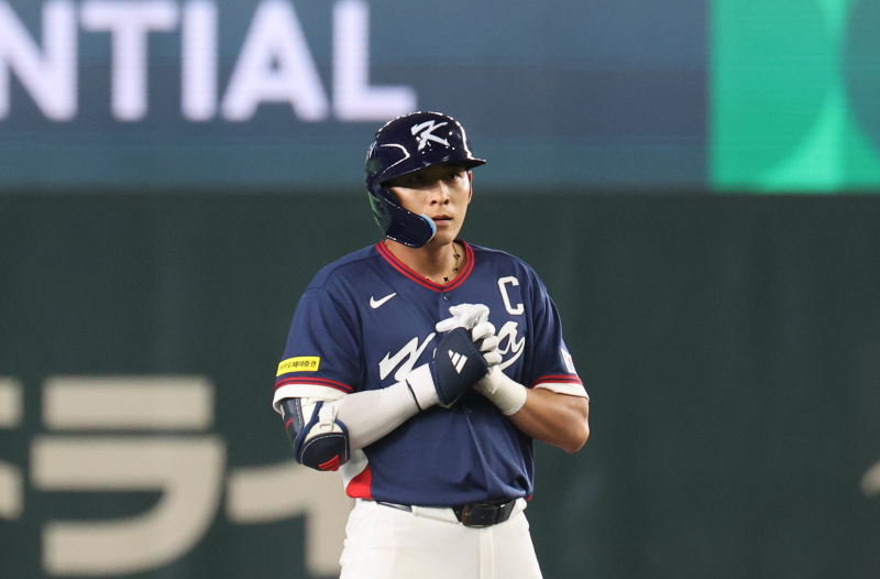9일 일본 도쿄돔에서 열린 2026 월드베이스볼클래식(WBC) C조 조별리그 최종전 대한민국과 호주의 경기. 3회초 무사 2루 한국 이정후가 1타점 2루타를 친 뒤 기도하고 있다. [사진=연합뉴스]