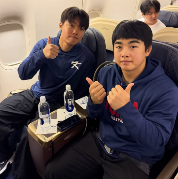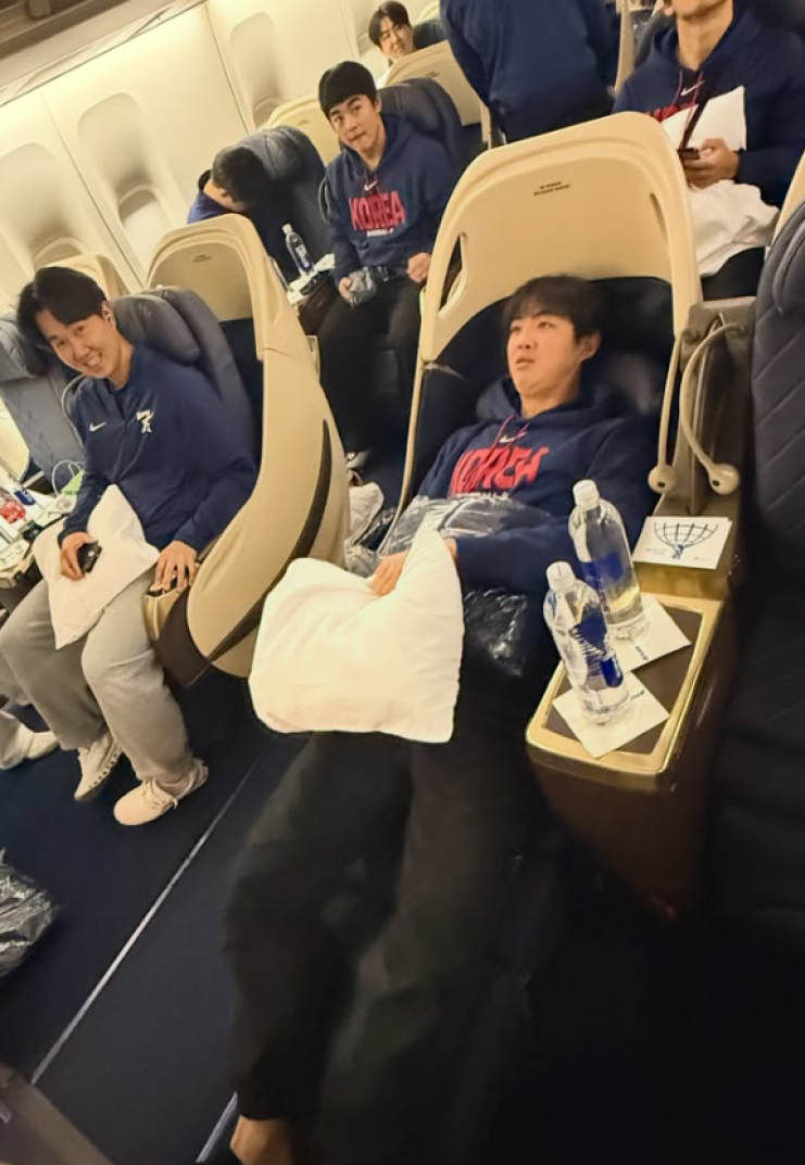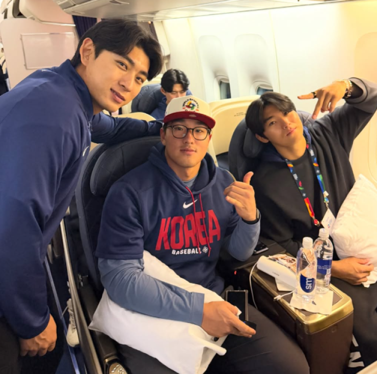한국야구위원회(KBO)는 11일 공식 SNS(소셜미디어)를 통해 전세기에 탑승한 선수단의 사진과 영상을 공개했다. 대표팀 주장 이정후(샌프란시스코 자이언츠)를 비롯해 안현민, 박영현, 소형준(이상 KT 위즈), 김도영(KIA 타이거즈), 문현빈, 정우주(이상 한화 이글스), 김영규(NC 다이노스), 유영찬(LG 트윈스) 등이 전세기 좌석에 앉아 카메라를 보며 환히 웃는 모습이었다.
