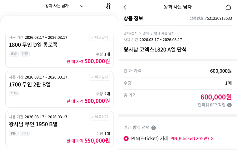 11일 티켓 거래 사이트 티켓베이 사이트에 따르면 영화 ‘왕과 사는 남자’(이하 ‘왕사남’) 흥행 감사 무대인사 티켓은 최고 60만원(오후 5시 30분 기준)에 거래되고 있다. 무대와 근접한 A, B, C열을 비롯해 통로쪽 좌석은 기본 50만원을 호가한다.