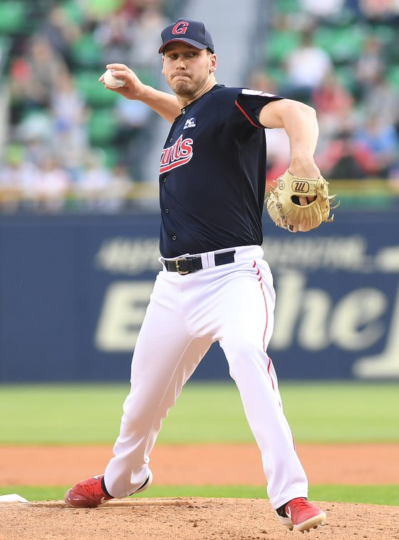 2019년 SK에서 활약할 당시 다익손. 다익손은 KBO리그 프로필상 키가 2m3㎝인 장신이다. IS 포토