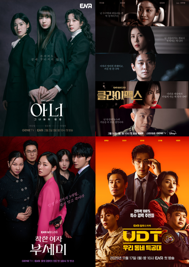 최근 종영한 ‘아너 : 그녀들의 법정’은 최종회에서 자체 최고 시청률 4.7%(닐슨코리아 전국 유료가구 기준), 2049 타깃 시청률 1.8%를 기록하며 성공적으로 막을 내렸다. 앞서 방송된 착한 여자 부세미’는 최종회 7.1%의 시청률을 기록했고, ‘UDT : 우리 동네 특공대’ 역시 높은 시청률로 화제를 모아 ENA 월화드라마 라인업의 경쟁력을 입증했다.