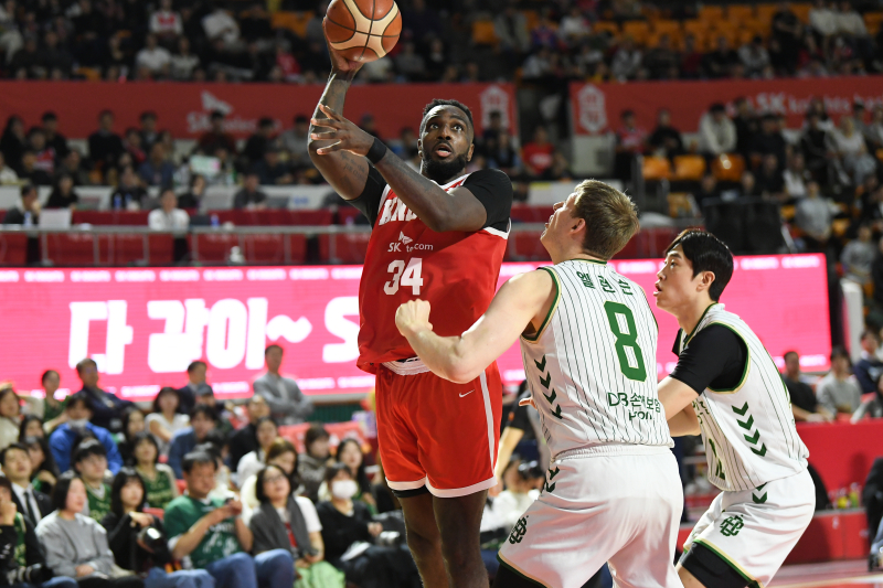 SK 워니가 12일 잠실학생체육관에서 열린 DB와의 2025~26 LG전자 프로농구 정규리그 경기서 슛을 시도하고 있다. 사진=KBL “부상 없이 좋은 분위기를 플레이오프(PO)까지 이어가야 한다.”