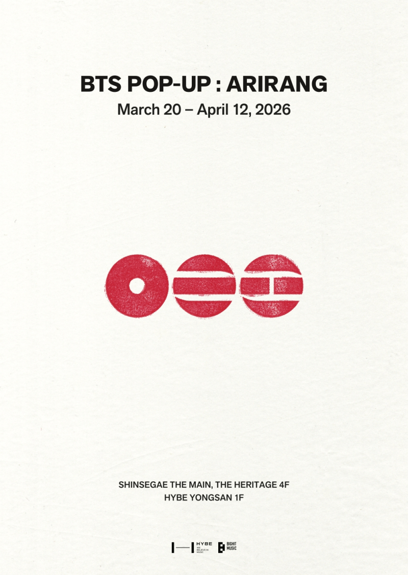 13일 소속사 빅히트 뮤직에 따르면 방탄소년단은 용산구에 위치한 하이브 사옥과 신세계백화점 본점 더 헤리티지(이하 신세계백화점 본점) 두 곳에서 3월 20일부터 4월 12일까지 ‘BTS 팝업 : 아리랑’(BTS POP-UP : ARIRANG)을 개최한다.