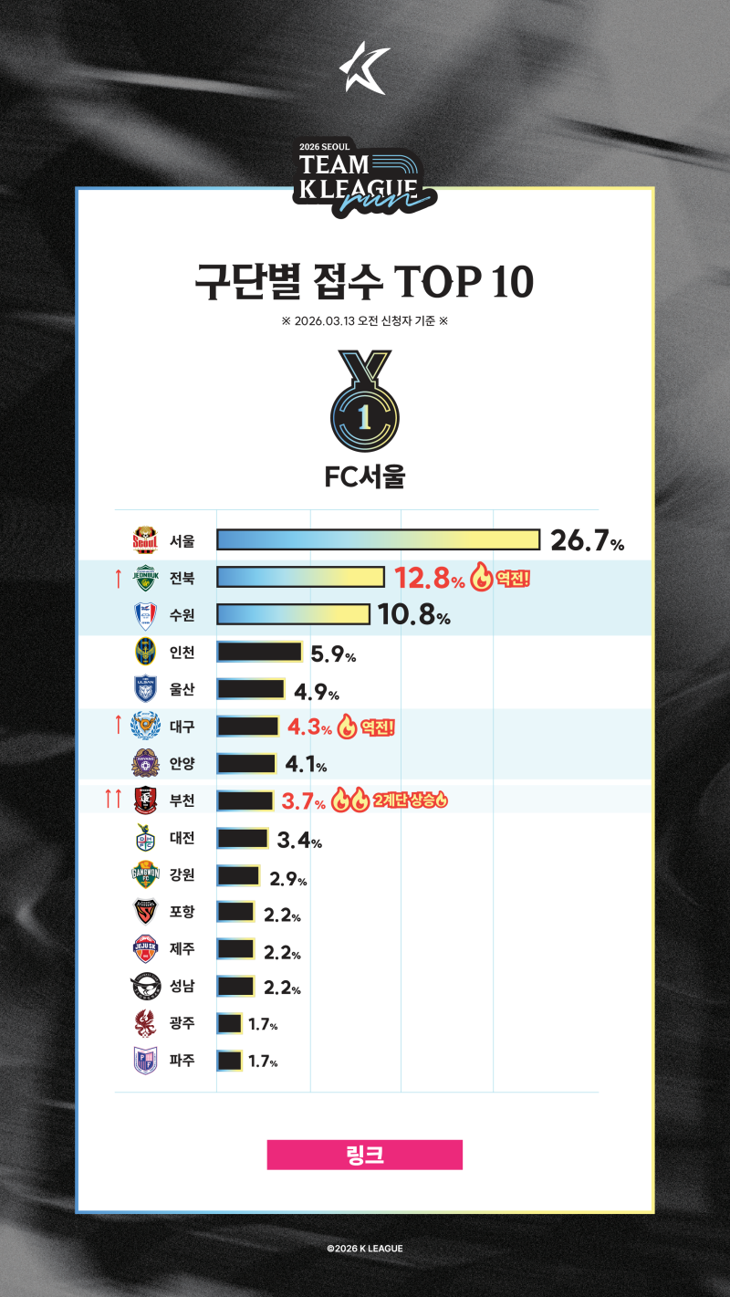 오는 28일 열리는 러닝 이벤트 ‘2026 서울 팀 K리그 런’을 앞두고 K리그 팬들의 참여 열기가 뜨겁게 달아오르고 있다. 참가자들이 응원하는 구단 유니폼을 입고 함께 달리는 이번 행사에서 현재까지는 FC서울 팬들이 가장 많은 참가 신청을 기록하며 선두를 달리고 있다.