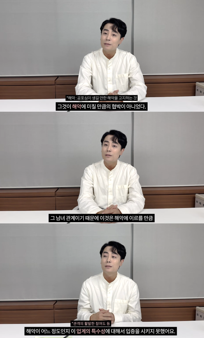 22분여 길이의 해당 영상에선 한지상이 A씨를 만나게 된 과정부터 △A씨가 성추행을 언급한 시점, △금전요구를 유도했다는 의혹, △A씨가 ‘3억 보상’을 주장한 이유, △사건을 외부에 알리지 않았다가 법적 대응에 나선 이유, △고소가 무혐의로 끝난 이유 등에 대한 구체적인 입장이 담겼다.