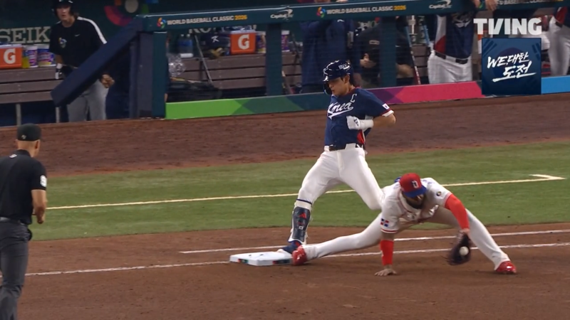 대표팀은 4회 초 선두 타자 저마이 존스(디트로이트 타이거즈)가 지난해 빅리그 13승 좌완 크리스토퍼 산체스(필라델피아 필리스)를 상대로 팀 첫 안타를 뽑고 출루했다. 대표팀의 4회 공격 때 내야 땅볼을 친 이정후의 발이 먼저 1루를 밟고 있다. 1루수가 아직 공을 완벽하게 잡지 못한 상태. 사진=티빙 중계화면 캡처 후속 타자 이정후는 투수 땅볼 앞 병살타로 아웃됐다. 그러나 이는 오심이다. 이정후의 오른발이 투수-유격수-2루수를 거쳐온 공보다 먼저 1루에 도착하는 것이 느린 중계 화면으로 확인됐다.