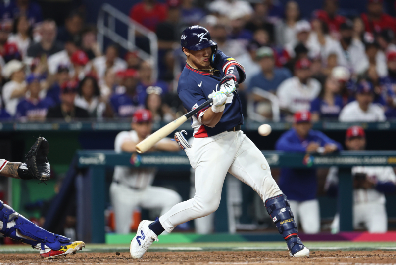 13일(현지시간) 미국 플로리다주 마이애미 론디포파크에서 열린 월드베이스볼클래식(WBC) 대한민국 대 도미니카공화국 준준결승전. 4회초 2사 한국 안현민이 2루타를 치고 있다. 사진=연합뉴스