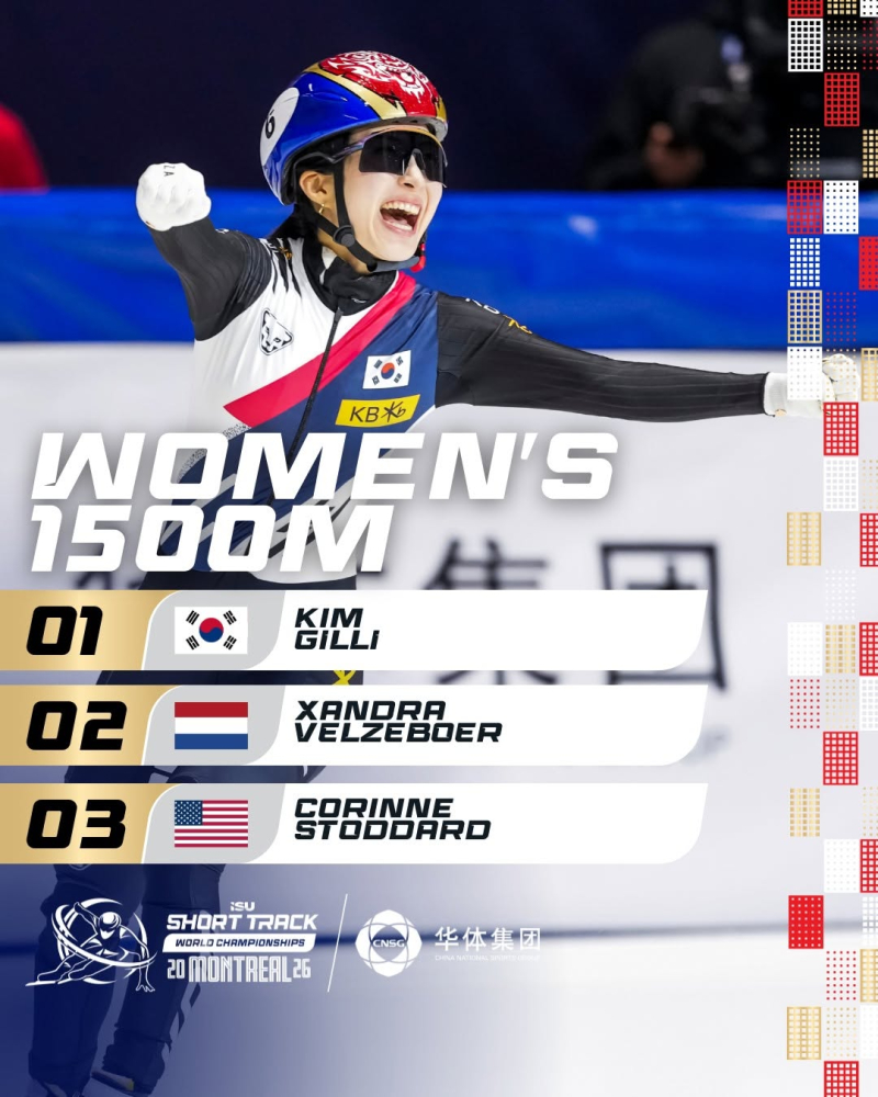 김길리는 16일(한국시간) 캐나다 몬트리올의 모리스 리처드 아레나에서 열린 대회 여자 1500m 결승에서 2분31초003을 기록, 잔드라 벨제부르(네덜란드·2분31초298)과 커린 스토더드(미국·2분31초386)를 제치고 우승했다.
