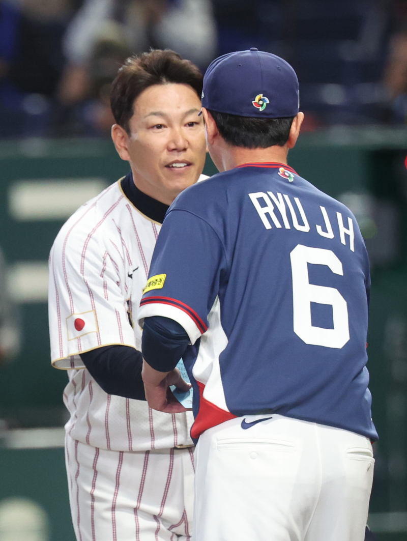 7일 일본 도쿄돔에서 열린 2026 월드베이스볼클래식(WBC) 조별리그 C조 2차전 대한민국과 일본의 경기에 앞서 한국 류지현 감독과 일본 이바타 히로카즈 감독이 라인업 교환을 하기 앞서 악수하고 있다. 2026.3.7 [연합뉴스]