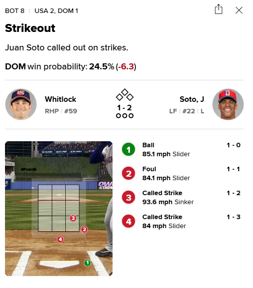 공 판정도 마찬가지다. 8회 말 도미니카공화국 선두 타자로 나선 후안 소토는 개럿 위틀록을 상대해 삼진으로 물러났는데, 그가 볼카운트 1볼-2스트라이크에서 골라낸 4구째 슬라이더는 9회 페르도모의 공처럼 S존에서 공 1개 만큼 아래에서 잡혔다. 소토는 구심에게 공 판정을 항의했지만, 이내 더그아웃으로 향했다.