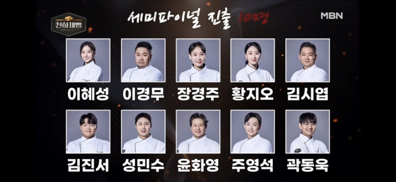 사진=MBN 제공 3라운드와 패자부활전을 통해 선발된 톱10 이혜성-이경무-장경주-황지오-김시엽-김진서-성민수-윤화영-주영석-곽동욱은 결승전으로 가는 마지막 관문인 ‘세미파이널’에 돌입했다. TOP10은 전국 10개 도시의 특산물을 활용한 K-로컬빵을 만들어야 하는 ‘로컬 헤리티지’ 미션에 돌입했고, 톱10은 단 7명만이 결승전에 진출한다는 사실에 긴장하며 결의를 다졌다. ‘로컬 헤리티지’ 미션에서는 빅데이터를 기반으로 새ㅇ, 깨수ㅇ, 제로펩ㅇ의 흥행 트렌드를 주도한 롯데웰푸드 푸드사업자 대표 여명랑이 스페셜 마스터로 나서 눈길을 끌었다.