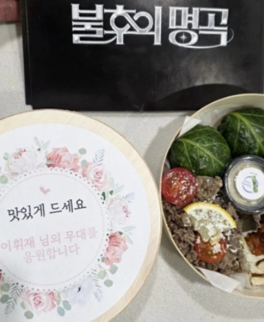 이휘재 측이 준비한 도시락 사진으로, 정갈한 음식들이 먹음직스럽게 배치돼 있다. 이와 더불어 ‘맛있게 드세요. 이휘재 님의 무대를 응원합니다’라는 문구가 부착돼 눈길을 끈다.