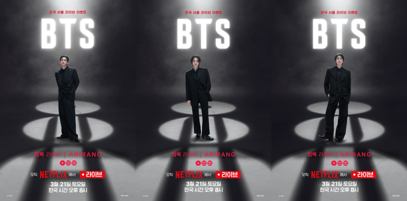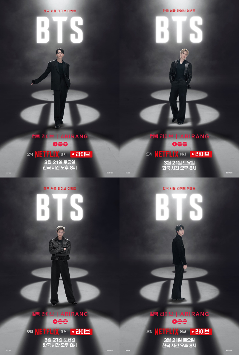 넷플릭스는 18일 ‘BTS 컴백 라이브: ARIRANG’ 솔로 포스터를 공개했다. 공개된 포스터에는 RM, 진, 슈가, 제이홉, 지민, 뷔, 정국까지 일곱 멤버 각각의 개성과 아우라가 담겨 시선을 사로잡는다. 특히 약 3년 9개월 만에 완전체 컴백을 알리는 무대라는 점에서 기대감이 더욱 높아지고 있다.