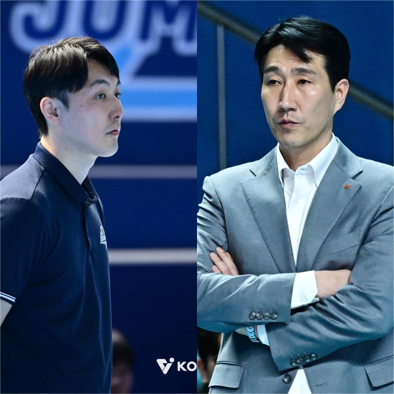 하현용(왼쪽) KB손해보험과 권영민 한국전력 감독. 사진=KOVO 봄배구 진출이 달린 경기. 하현용 KB손해보험 감독대행, 권영민 한국전력 감독의 메시지는 똑같았다.
