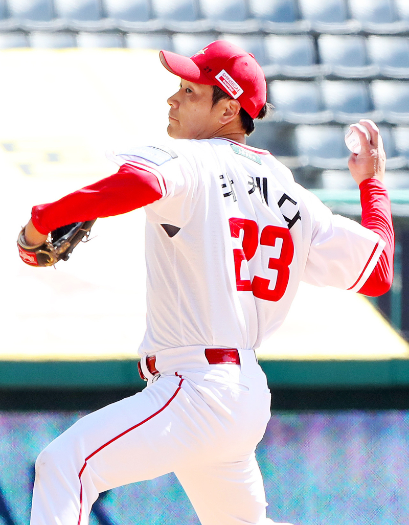 타케다는 19일 인천SSG랜더스필드에서 열린 LG 트윈스와의 시범경기에 선발 등판, 3이닝 3피안타 5사사구 2탈삼진 2실점했다. 투구 수 68개(스트라이크 34개). 오는 28일 정규시즌 개막을 앞두고 투구 수를 늘렸지만, 시범경기 첫 등판이었던 지난 13일 광주 KIA 타이거즈전 3이닝 퍼펙트 피칭과 비교하면 차이가 뚜렷했다.