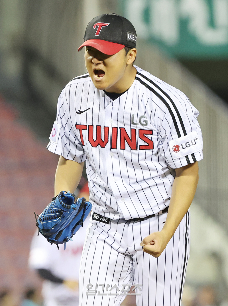 2025 KB0리그 프로야구 LG 트윈스와 NC 다이노스의 경기가 23일 오후 서울 잠실야구장에서 열렸다. 4회초 2사 1루 김휘집을 삼진으로 잡아낸 투수 송승기가 포효하고 있다. 잠실=김민규 기자 /2025.04.23/