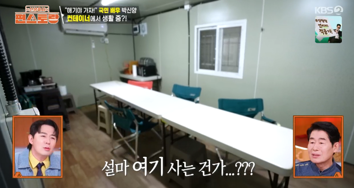이날 박신양이 생활하는 안동의 창고 안 컨테이너의 모습이 그려졌다. 붐은 “상황이 안 좋아진게 아니냐”며 사업 실패설을 제기했다. 사진=KBS2 정작 컨테이너에서 박신양은 제작진을 위해 직접 커피를 끓이고 사과도 깎아 대접했다. 사과를 한입 먹은 그는 “이거 ‘야르’네”라며 MZ신조어도 써 눈길을 끌었다.