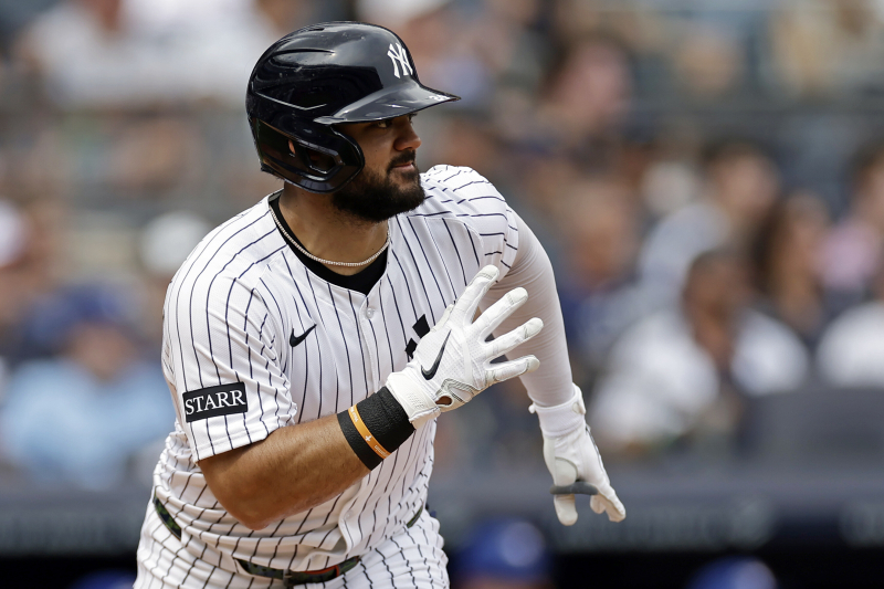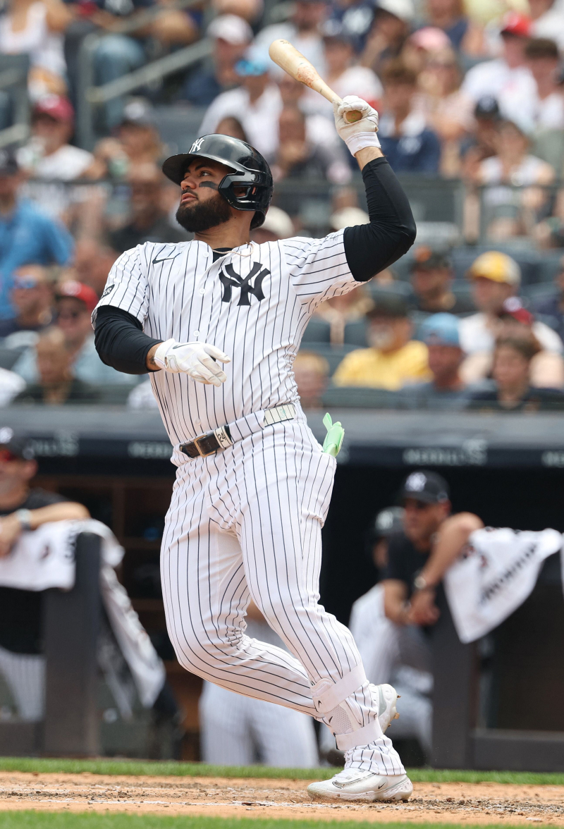 New York Yankees' Jasson Dom?nguez hits a run scoring single during the second inning of a baseball game against the Toronto Blue Jays, Saturday, Sept. 6, 2025, in New York. (AP Photo/Adam Hunger)/2025-09-07 06:49:02/ <저작권자 ⓒ 1980~2025 ㈜연합뉴스. 무단 전재 재배포 금지, AI 학습 및 활용 금지>