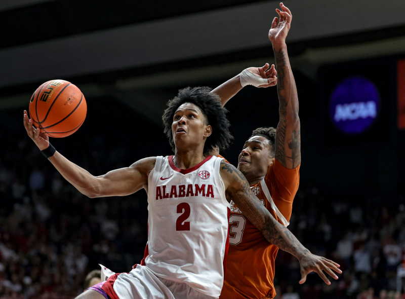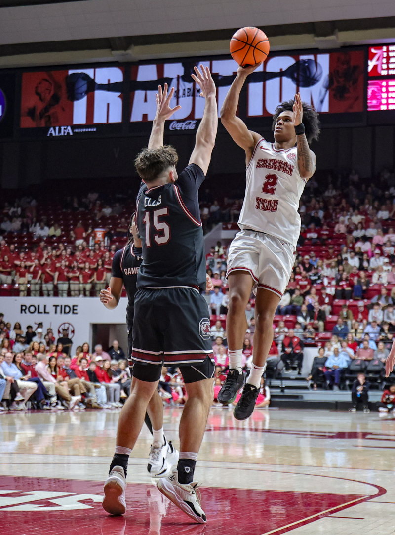 TUSCALOOSA, ALABAMA - FEBRUARY 14: Aden Holloway #2 of the Alabama Crimson Tide shoots over Eli Ellis #15 of the South Carolina Gamecocks in the second half at Coleman Coliseum on February 14, 2026 in Tuscaloosa, Alabama. Brandon Sumrall/Getty Images/AFP (Photo by Brandon Sumrall / GETTY IMAGES NORTH AMERICA / Getty Images via AFP)/2026-02-15 12:44:12/ <저작권자 ⓒ 1980~2026 ㈜연합뉴스. 무단 전재 재배포 금지, AI 학습 및 활용 금지>