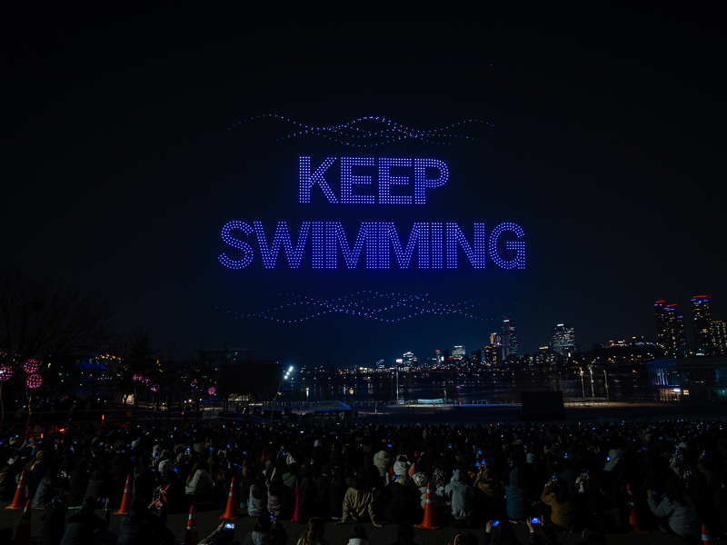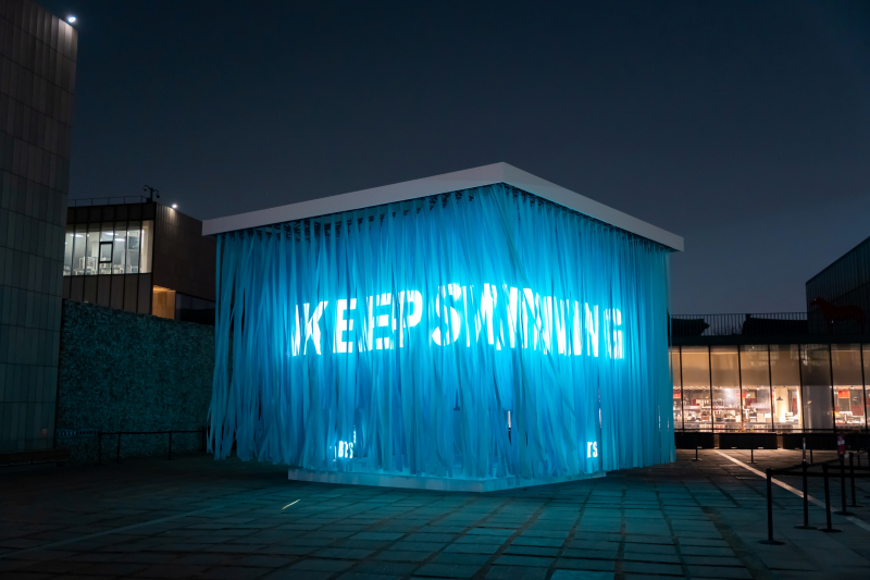 사진=빅히트뮤직 제공 국립현대미술관 마당에 설치된 큐브 모양의 조형물도 시민들의 눈길을 사로잡았다. 방탄소년단의 신보 타이틀곡 ‘스윔’(SWIM)이 떠오르는 바다 빛 외관에 ‘KEEP SWIMMING’이라는 문구를 띄워 곡의 메시지를 전했다. 조형물에 달린 테슬이 바람에 흔들리는 소리가 마치 파도 소리처럼 번져, 도심 한복판에서 즐기는 힐링의 시간을 선물했다. 또 여의도와 DDP 등 주요 거점에서 진행된 스탬프 랠리에도 많은 사람이 몰렸다.