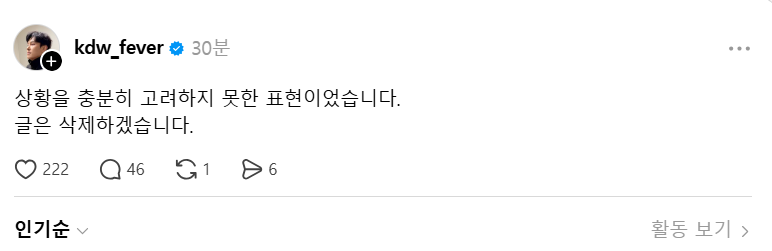 사진=김동완 SNS 캡처 이런 상황에서 김동완이 “아무 이유 없이”라며 MC딩동을 응원하는 글을 올린 것. 이후 누리꾼들의 싸늘한 반응이 이어지자 김동완은 재차 글을 올려 “상황을 충분히 고려하지 못한 표현이었다”고 해명하며 문제의 글을 삭제했다.