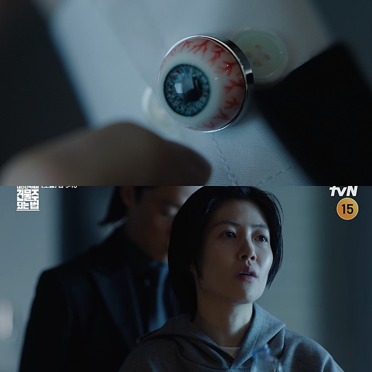 주말은 심은경이 책임진다. 그는 ‘대한민국에서 건물주 되는 법’(이하 ‘건물주’)를 통해 리얼캐피탈의 실무자 요나 역으로 첫 악역을 맡았다. 등장부터 강렬했다. 피투성이가 된 남성이 “살려만 달라”고 애원하자, 웃으면서 그 건물자체를 폭파시켜버린다. ‘세이렌’ 김정현과 공통점이 있다면 바로 ‘양면성’이다. 좋아하는 여인에게는 그 누구보다 스윗한 눈빛과 말투를 보여주는 김정현처럼 심은경은 타인의 목숨을 위협하다가도 길가의 달팽이를 소중히 보살피는 천진난만한 모습을 보인다. 사진=유튜브 채널 ‘tvN DRAMA’ 캡처 심은경에게 ‘건물주’는 6년 만의 한국 드라마 복귀작이다. “촬영장에 가는 게 설레었다”고 스스로 말할 만큼 애정이 깊다. 그래서일까. 장면 곳곳에 디테일이 숨어 있다. 대표적인 건 1화 속 기수종(하정우)에게 건물 점유를 압박하는 통화 장면. 이때 요나의 오른쪽 셔츠 커퍼스에 핏발 선 기괴한 눈동자 장식이 눈길을 끈다. 이는 영화 ‘시계태엽 오렌지’에서 가져온 레퍼런스로 심은경이 직접 제안했다. 눈가의 붉은 음영역시 “섬뜩하면서도 아이 같은 면을 동시에 강조하고 싶었다”는 심은경의 열정이 들어간 디테일이다.