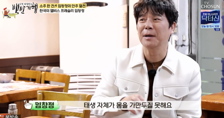 사진=TV조선 방송 캡처 이어 허영만은 “배우와 가수를 겸업하는 게 옛날의 엘비스 프레슬리 같다. 어려울텐데 어떻게 조절하냐”고 물었고, 임창정은 “태생 자체가 몸을 가만히 못 둔다. 뭐를 해야 하고 호기심이 많다. 연예인이 꿈이었다. 개그맨도 좋고, 가수, 연극배우, 뮤지컬배우 등 뭐든 연예인(이되고 싶었다)”이라고 답했다. 허영만은 “에너지가 넘친다. 게으른 사람은 호기심이 있어도 머리로만 생각하고 몸이 안 따라간다”며 감탄했다.