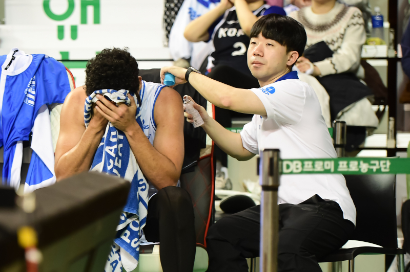 22일 원주DB프로미아레나에서 열린 2025~26 프로농구 정규리그 원주 DB 원정 경기에서 부상을 당한 베니 보트라이트가 벤치에서 휴식하고 있다. KBL 제공
