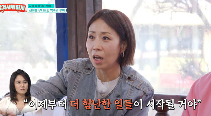 정선희는 “어떤 시점에서 소문 몇 개가 되게 사실처럼 자리잡았고, 그걸 내가 적극적으로 해명할 수 있는 시기는 아니었다”며 “그러면서 싸우기를 포기했다. 너무 해일처럼 덮쳐서 숨고 있었지 싸울만한 용기도 기력도 없었다”고 떠올렸다.