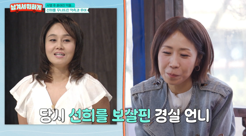 그러면서 정선희는 “인생 끝났다고 생각했고, 생매장당하는 꿈도 몇 년을 꿨다. 그런데 경실 언니는 계속 연락해서 뭘 먹이고 했다. 단 한번도 ‘너 이제부터 어떻게 할 거야?’라고 물어본 적이 없다”고 가장 힘들 때 힘이 되어줬다고 했다.