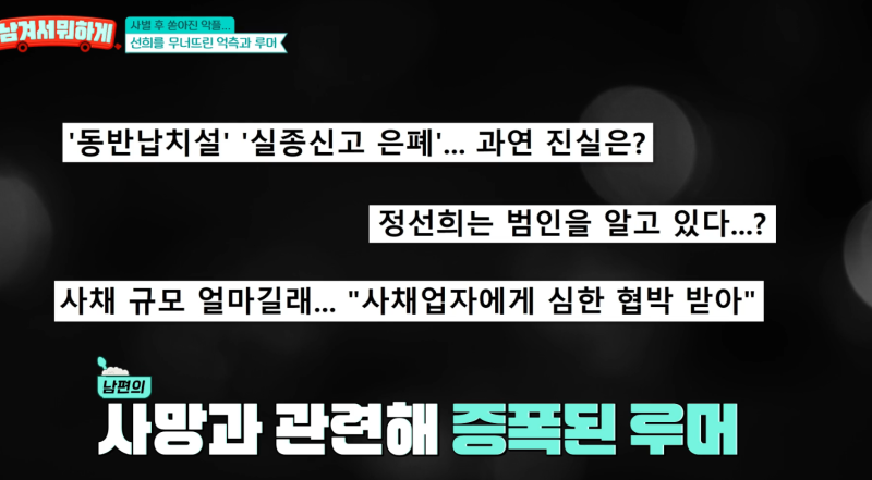 앞서 정선희는 2007년 11월 배우 안재환과 결혼했으나 결혼 10개월 만에 사별했다. 이후 남편의 죽음에 정선희가 관련되어있단 각종 루머와 악성 댓글에 시달려야했다.