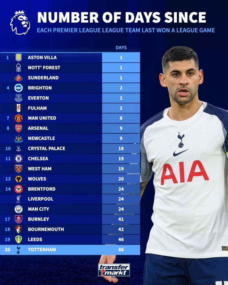 유럽 축구 통계 매체 트랜스퍼마르크트 영국판 소셜미디어(SNS)는 24일(한국시간) EPL 20개 구단의 가장 마지막 리그 승리를 거둔 시점을 돌아봤다. 현재 A매치 휴식기를 앞두고 EPL 31라운드를 소화한 구단 중 애스턴 빌라, 노팅엄 포레스트, 선덜랜드, 브라이턴 앤 호브 알비온, 에버턴, 풀럼은 마지막 승리 뒤 단 1~2일 지나 있었다.