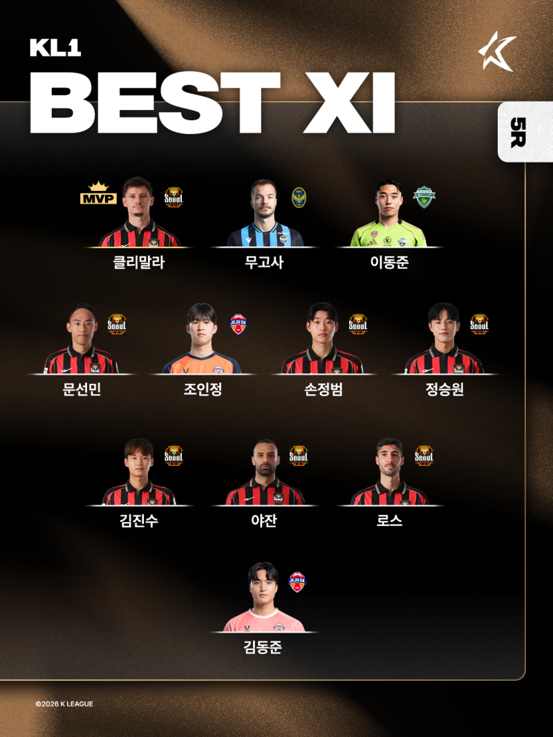 24일 프로축구연맹은 하나은행 K리그1 2026 5라운드 최우수선수(MVP), 베스트 팀, 베스트 매치, 베스트11을 차례로 공개했다.