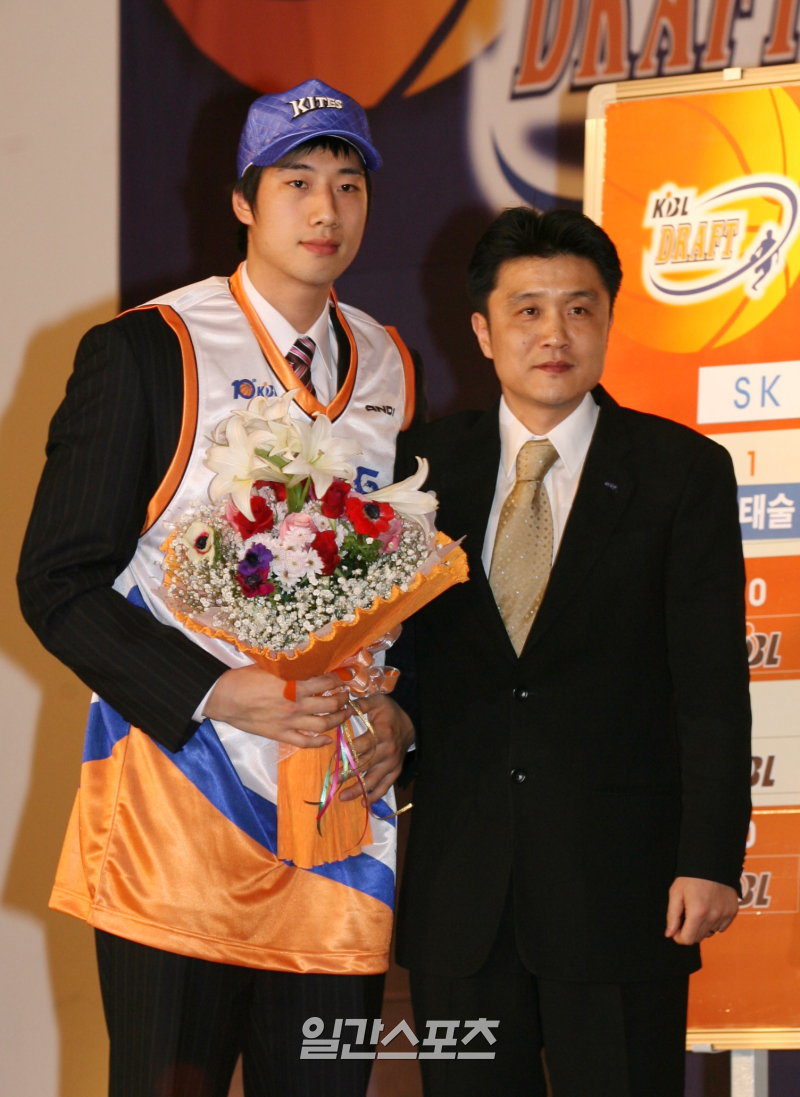 지난 2007년 KBL 신인드래프트 1라운드 3순위로 안양 KT&G 유니폼을 입은 양희종(왼쪽). 오른쪽은 유도훈 감독. 사진=IS포토