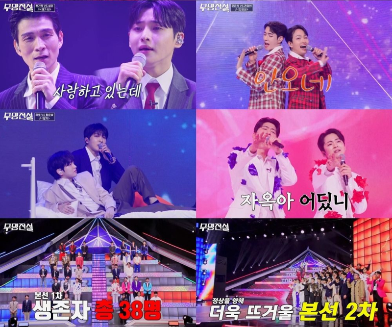 먼저 무·유명 4위이자 리더 이대환, 박민수 팀이 ‘사랑의 사내’를 주제로 맞붙게 됐다. 이대환 팀에는 유지우 한눌 최우진 이다온이, 박민수 팀은 고영태 서희철 김태수가 뭉쳤다. 나훈아의 ‘몰라’를 선곡한 이들은 흔들림 없는 라이브를 기반으로, 몸을 던지는 스턴트 액션과 칼군무까지 고난도 퍼포먼스를 선보이면서 한 편의 영화 같은 무대를 완성했다.