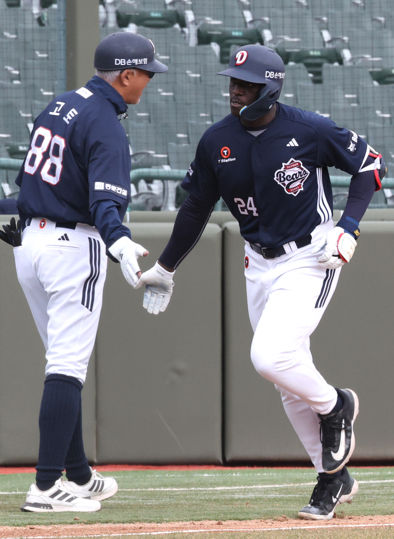 19일 부산 사직야구장에서 열린 프로야구 두산 베어스와 롯데 자이언츠의 시범경기. 5회 초 1사 2, 3루에서 두산 카메론이 좌중월 3점 홈런을 치고 3루 베이스를 돌고 있다. 2026.3.19 [연합뉴스]
