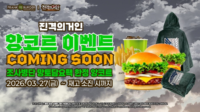 프랭크버거가 인기 애니메이션 '진격의 거인'과 협업한 '조사병단 담요팩' 앵콜 프로모션을 3월 27일부터 한정 수량으로 진행한다. 지난 1월 1차 프로모션이 전 매장 완판과 오픈런 현상을 기록하며 큰 호응을 얻은 바 있다. 이번에는 쉬림프버거 세트와 치즈버거 세트에 망토담요를 결합한 상품으로 팬들의 기대를 모으고 있다.