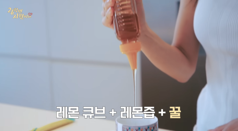 먼저 하지원은 주방으로 향해 냉장고에서 레몬을 꺼냈다. 그가 공개한 냉동실에는 레몬을 큐브 모양으로 소분해 얼려놓은 통이 가득했고, 하지원은 레몬 한조각을 꺼내 레몬즙과 따뜻한 물, 꿀을 넣은 레몬 꿀차를 완성했다. 하지원은 “매일 아침 15년째 마신다”며 꾸준한 관리 비결이라고 밝혔다. 사진=유튜브 채널 ‘26학번 지원이요’ 사진=유튜브 채널 ‘26학번 지원이요’