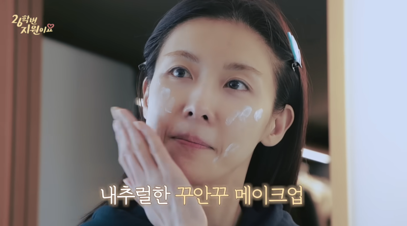 사진=유튜브 채널 ‘26학번 지원이요’ 기초 메이크업도 탄탄하게 올렸다. 하지원은 피부타입이 악건성이라며 “팩을 엄청나게 한다. 아침부터 도배를 해야 한다”라고 말했다.