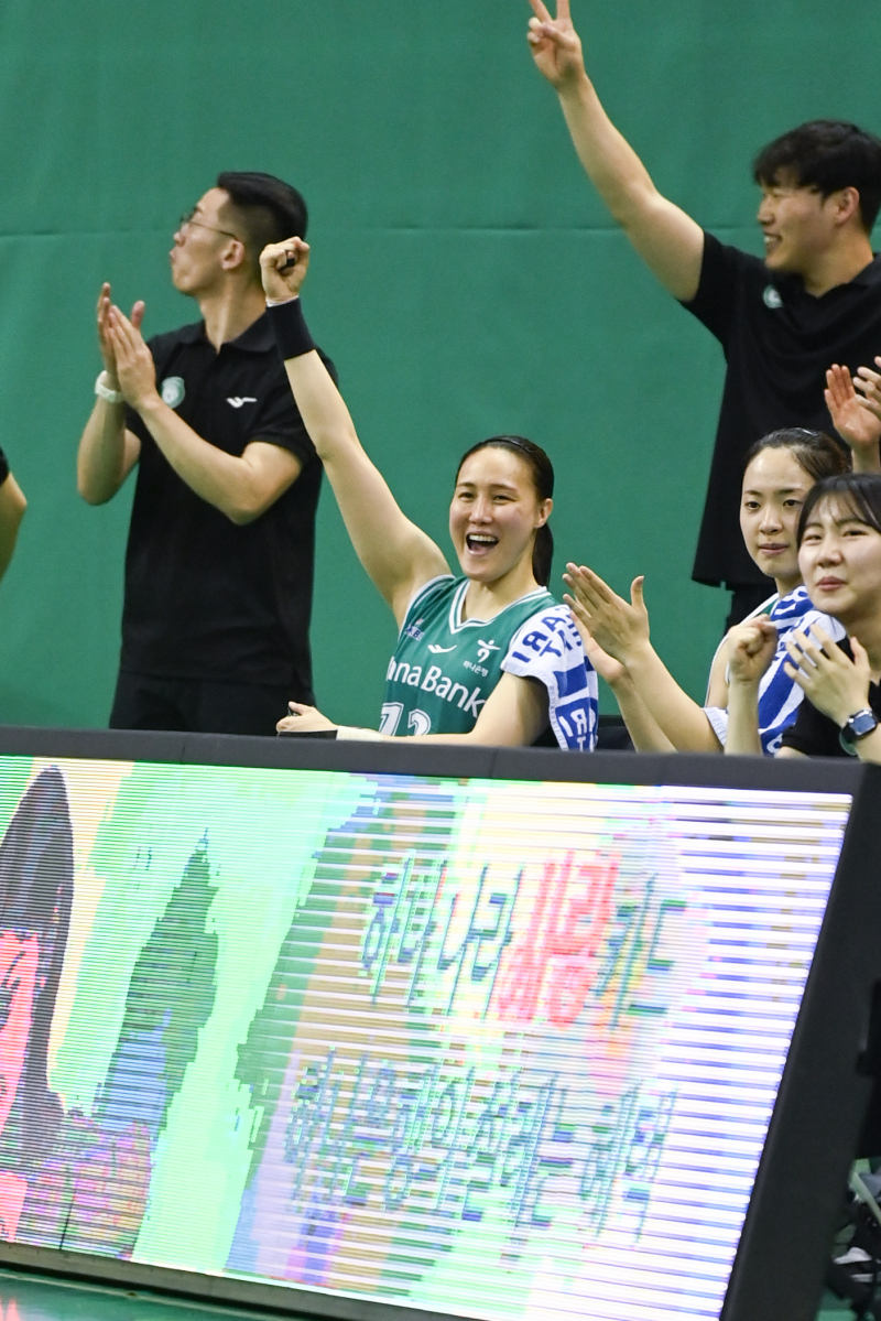 하나은행 김정은 등 선수단이 29일 부천체육관에서 열린 삼성생명과의 BNK금융 2025~26 WKBL 정규리그 홈경기서 환호하고 있다. 사진=WKBL 전열을 정비한 3쿼터, 삼성생명에선 이주연과 이해란의 득점포가 나오며 추격했다. 하나은행은 공격 시간이 부족함에도 진안, 정현의 득점으로 격차를 유지했다.