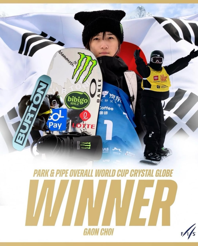2008년생인 최가온은 지난해 12월 중국 시크릿가든, 미국 코퍼마운틴 대회에서 월드컵 2개 대회 연속 우승을 차지했다. 지난 1월엔 스위스 락스 대회를 제패하고, 2월 밀라노·코르티나 동계올림픽에선 부상 투혼 끝에 하프파이프 정상에 오르며 최고의 한 해를 보냈다. 그는 부상 여파로 월드컵에 추가로 나서진 못했지만, 이 종목 최고의 선수가 됐다.