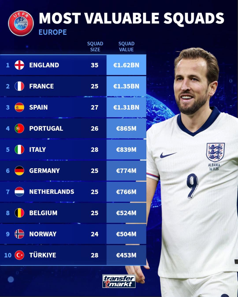 한편 매체 기준 세계에서 가장 비싼 선수단은 잉글랜드였다. 잉글랜드의 시장 가치는 16억 2000만 유로(약 2조 8300억원)에 달한다. 다만 해당 집계서 잉글랜드 선수단은 선수가 35명에 달하는 만큼, 25~28명의 선수들로 이뤄진 다른 국가와는 차이가 생길 수밖에 없다.